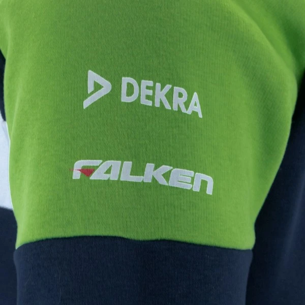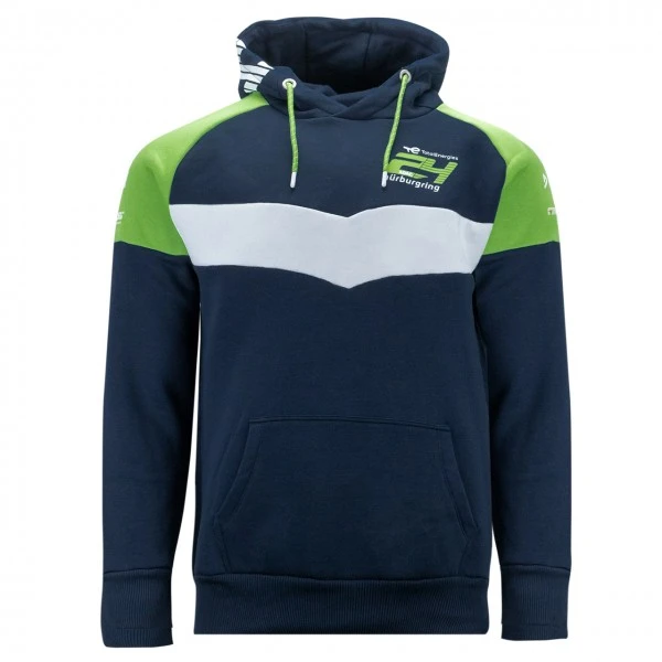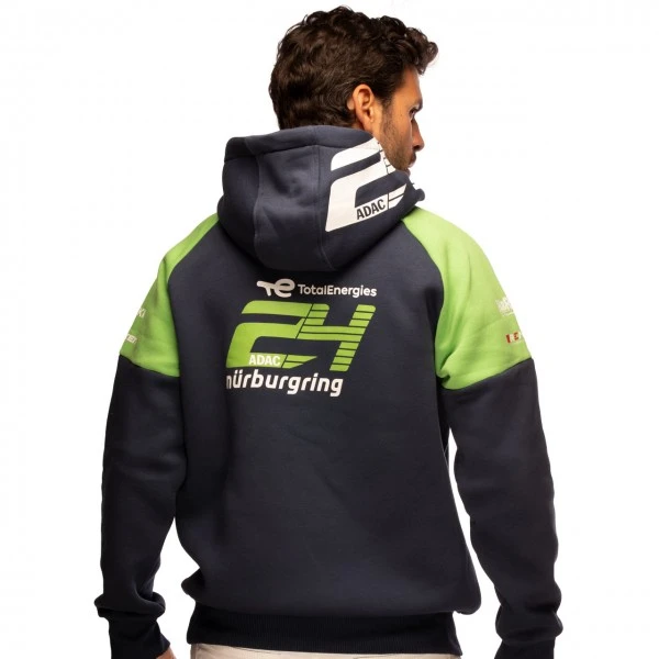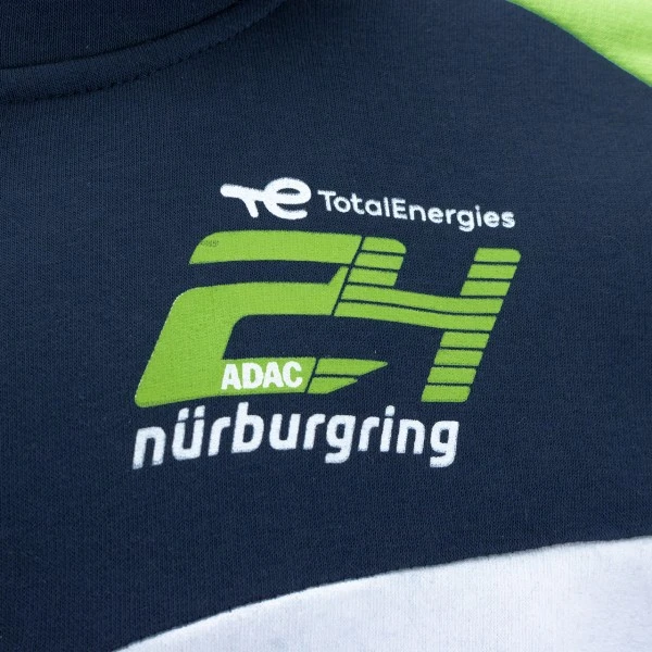 The blue-green hoodie is part of the official 24h-Race Nürburgring Sponsor-Collection 2022 and is made of high quality cotton with polyester content. In addition to jumpers, the collection includes other products such as caps, shirts, jackets and more with 24h and sponsor branding.