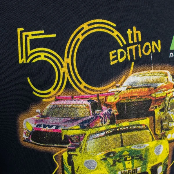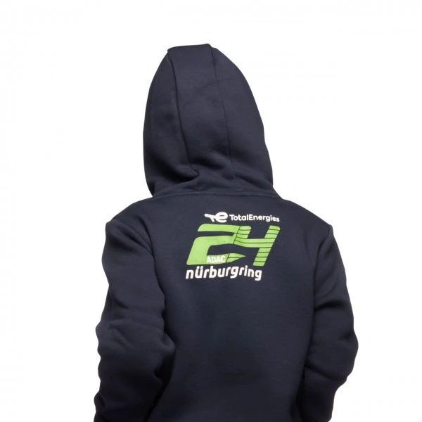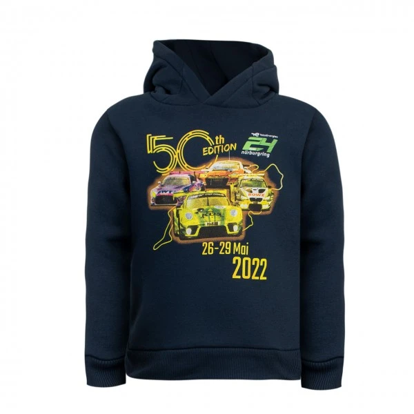 The blue 50th Edition hoodie for kids is part of the official 24h Race Nürburgring Fan Collection 2022 and honours the 50th edition of the race. In addition to jumpers, the collection includes other products such as caps, shirts, jackets and more with 24h and sponsor branding.