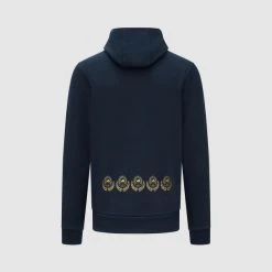 A 50th Edition digital print is applied to the front of the blue hoodie made of high-quality cotton with polyester content. The 24h logo is printed on the back as a pigment print.