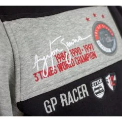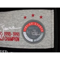This remarkably detailed sweat jacket combines sporty design with Ayrton Senna’s records and is a very special piece of clothing.