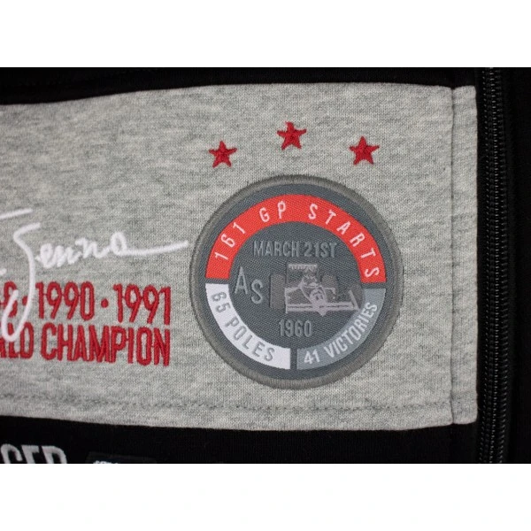 The sweat jacket is dedicated to Ayrton Senna’s 41 Formula 1 victories and features numerous high-quality embroideries and appliqués. Like Senna’s quote: “Winning is the most important, everything is consequence of that”.