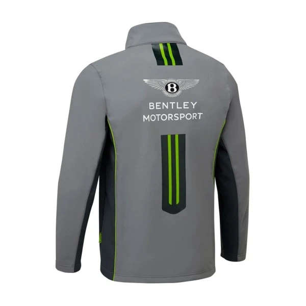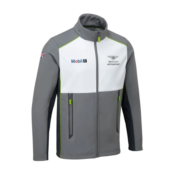 The softshell jacket in grey is part of the official Bentley Motorsport team collection, which includes jackets as well as other team branded products such as t-shirts, polo shirts, caps and more.