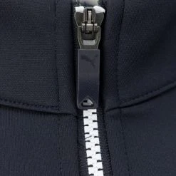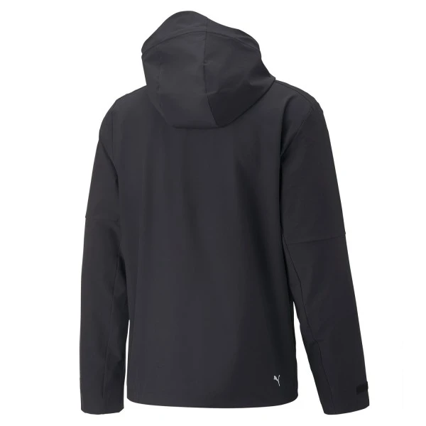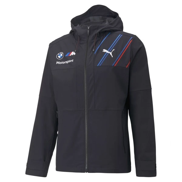 The grey BMW Motorsport rain jacket from the BMW Motorsport Team collection. The hooded jacket is made from rainproof polyester with added elastane and features the BMW Motorsport logo and Puma emblem printed on the front. Other details include two zipped side pockets and size-adjustable cuffs.