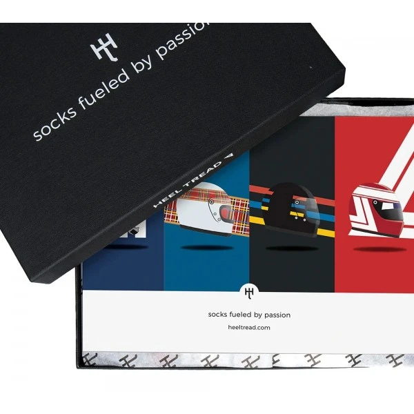 Stylish socks based on the helmet designs of Formula 1 legends such as Graham Hill, Jackie Stewart, James Hunt and Niki Lauda – all Formula 1 World Champions of the 60s and 70s and icons of their sport.