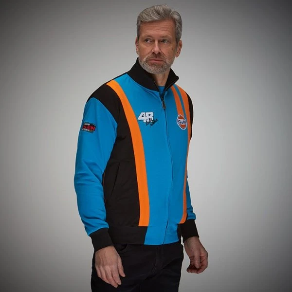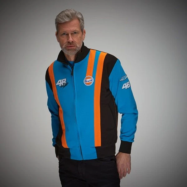 Lightweight transitional jacket from the Gulf racing team made of polyester in cobalt-blue with orange stripes and the starting number 48, based on the colours and starting number 48 of the Gulf Euro Team from the American Nascar racing series. With contrasting stripes, patches and close-fitting waistbands / cuffs. The perfect sporty look for the race track!