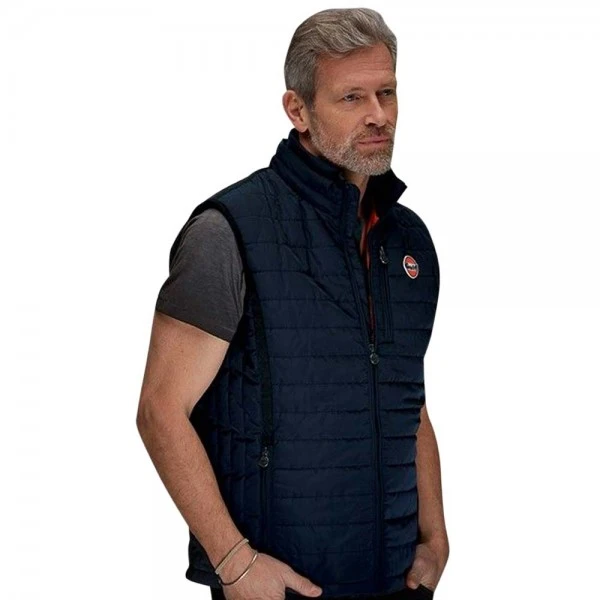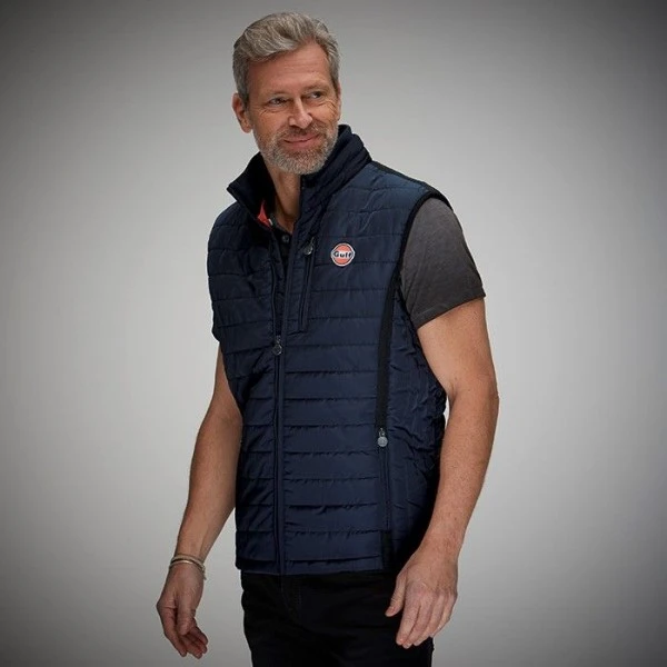 Perfectly fitting waistcoat made of soft and easy-care nylon in Gulf Racing design, as a tribute to the Gulf racing cars from the 70s. The inner lining features a large Union Jack print, colour-matched to the navy blue. The historic Gulf logo made of rubber on the chest is of course not to be missed.