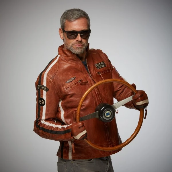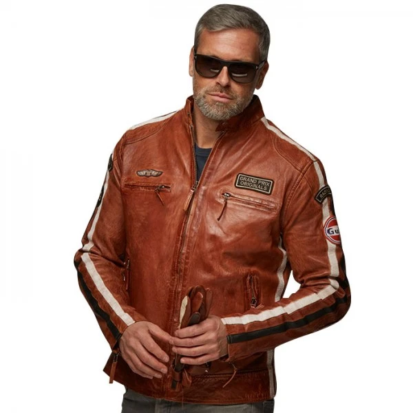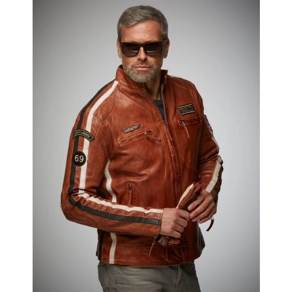 Light leather jacket for men made of lamb leather in a great cognac colour from the racing team Gulf. With contrasting stripes, patches and four pockets with zippers.