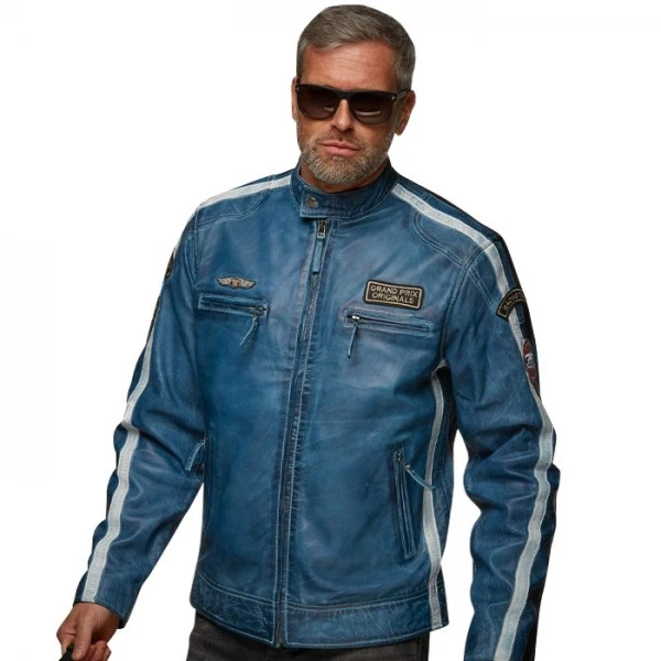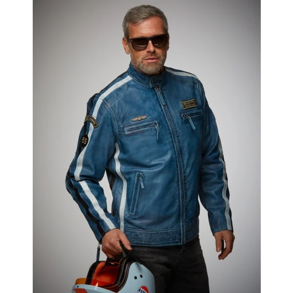 Light leather jacket from the racing team Gulf made of lamb leather in a great blue colour. With contrasting stripes, patches and four pockets with zippers. For the perfect look!