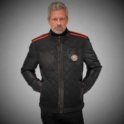 Stylish performance jacket from the Gulf racing team in a great indigo colour. With refined details and colour-contrasting racing stripes on the shoulder. The outer material of the jacket consists of a mixture of nylon and lambskin, as well as a soft nylon lining. The jacket impresses with its excellent workmanship and forms the reference to the historic racing sport of the Gulf Oil Racing brand through its colour design and the many details.