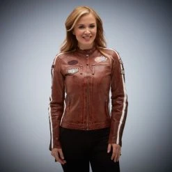 Cognac Gulf Racing Leather Jacket for women in washed lamb leather.