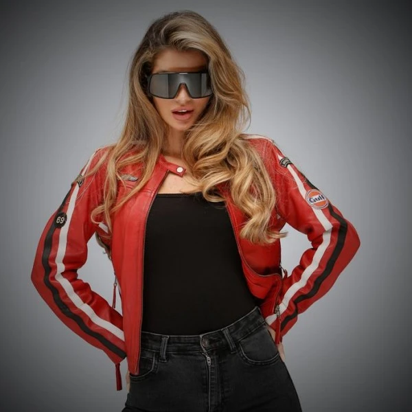 Lightweight leather jacket for women made of lambskin in a great red colour from the Gulf racing team. With contrasting stripes, patches and four pockets with zips.