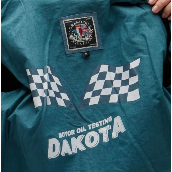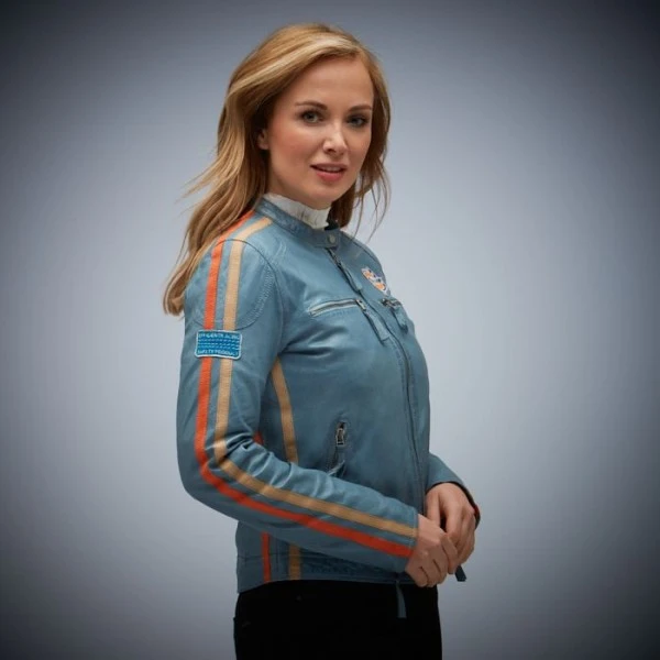 Light leather jacket for ladies made of lambskin in a great light blue colour from the Gulf racing team. With contrasting stripes, patches and four pockets with zips.