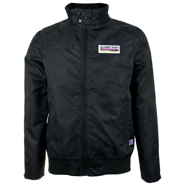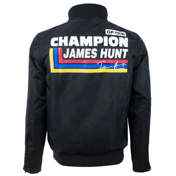 The James Hunt jacket Silverstone has a large lettering of “James Hunt World Champion” on the back and small logo on the chest. The design picks up the James Hunt helmet design with the three colors red, blue and yellow.