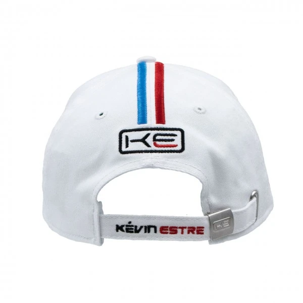The white cap with round peak from the Kévin Estre collection. In addition to caps, the collection also includes other products such as shirts, jumpers and accessories.