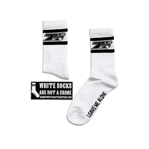 The white socks “Leave Me Alone” from the Kimi Räikkönen collection by West Coast Choppers have the “Cross Seven” logo in the cuffs, a combination of Kimi’s starting number 7 and the West Coast Choppers cross logo. The inscription “Leave Me Alone” is sewn into the footbed.