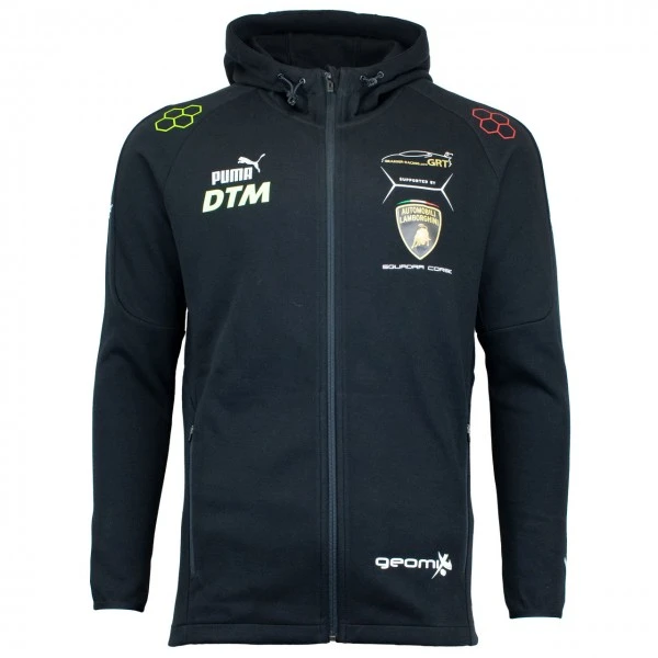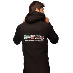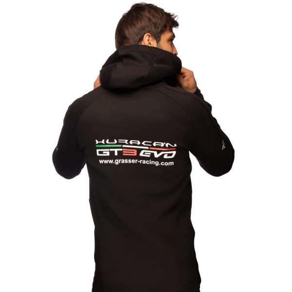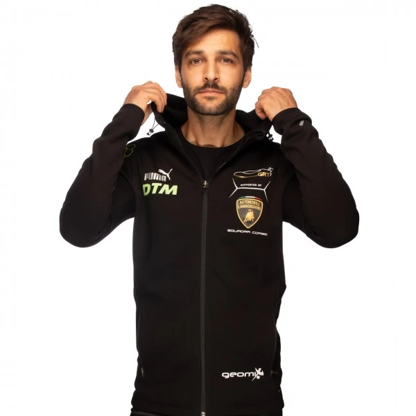 The black hooded sweat jacket is part of the Lamborghini GRT collection, which includes jackets as well as other products such as shirts, caps and accessories.