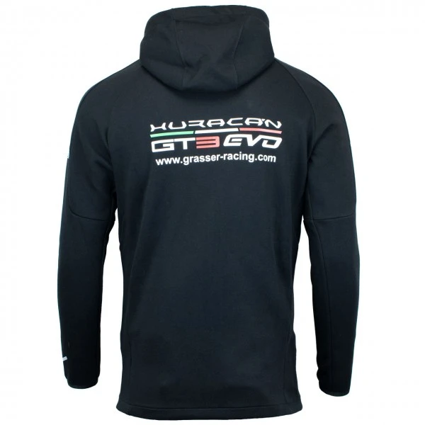 The official hooded sweat jacket in black from the Lamborghini Grasser Racing Team collection. The sweat jacket with hood, tight-fitting cuffs and two zipped side pockets is printed with the GTR and Lamborghini logo on the front. The Huracán GT3 Evo lettering can be seen on the back. The material is made of high-quality cotton with polyester content.