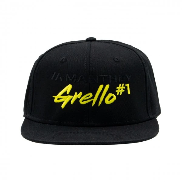 The black cap with flat peak from the Manthey Grello collection. Besides caps, the collection includes other products such as shirts, jumpers, jackets and accessories.