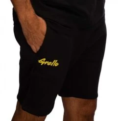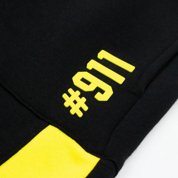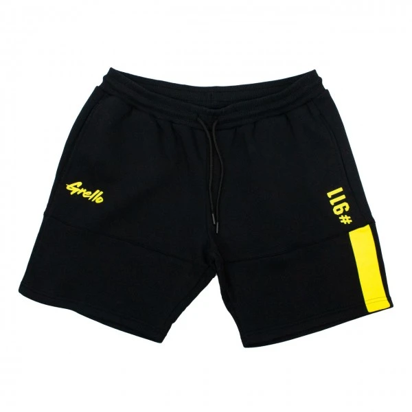 The yellow and black sweatshorts for men from the Manthey Grello collection. In addition to shorts, the collection also includes other products such as caps, shirts, jumpers and accessories.