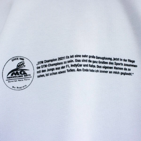 The white jumper with hood is part of the Maximilian Götz collection, which was released in honour of his DTM championship title in 2021. Besides jumpers, the collection also includes other products such as T-shirts, caps and accessories.
