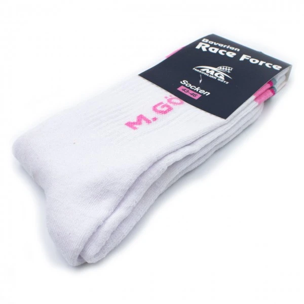 The socks in white with applications in pink, grey and black from the Maximilian Götz collection are made of easy-care polyester with added polyamide and elastane. In addition to the M.Götz lettering on the top, the No. 1 logo can be seen on the bottom.