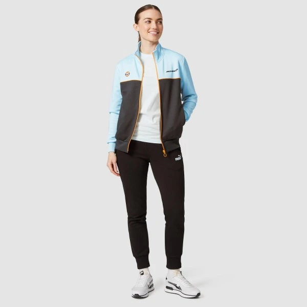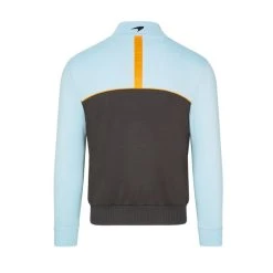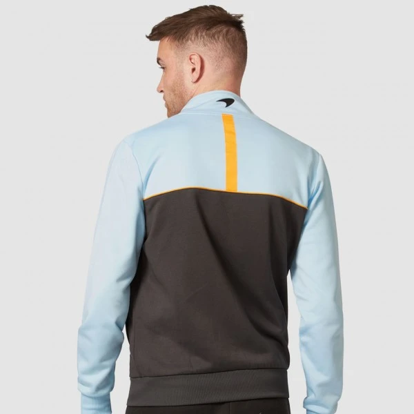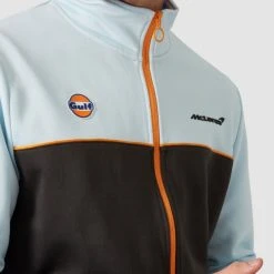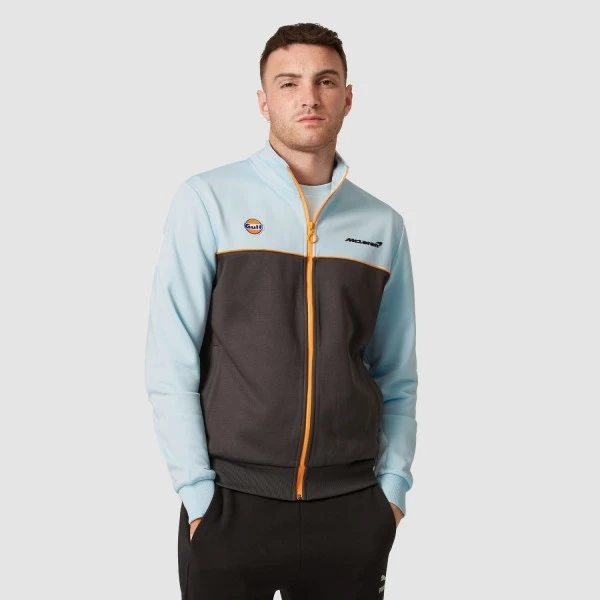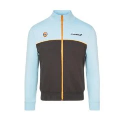 The training jacket in anthracite/blue is part of the official McLaren Gulf collection, which includes jackets as well as other products such as T-shirts, sweatshirts and polo shirts.