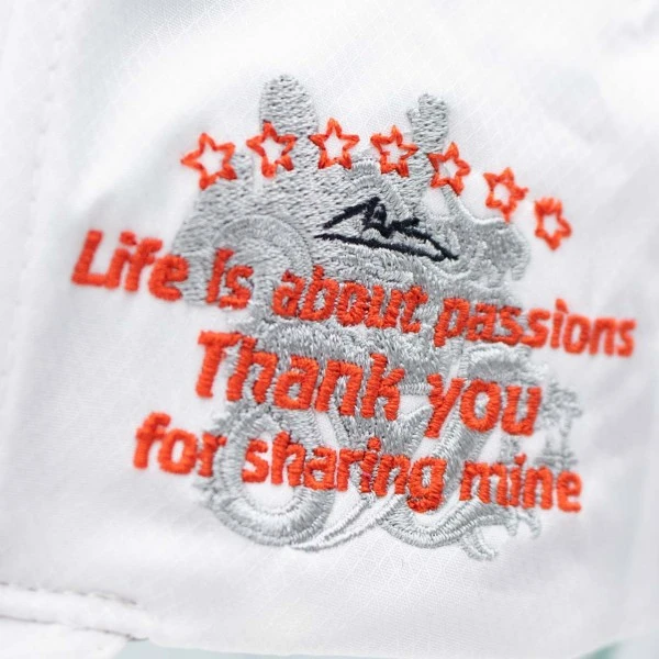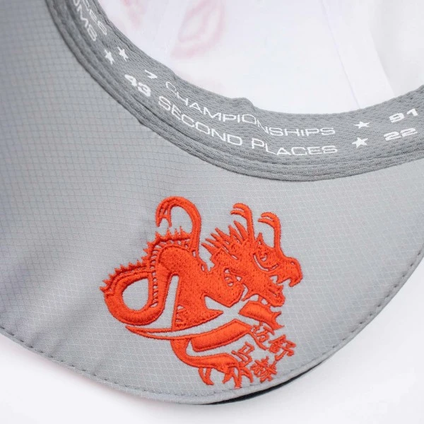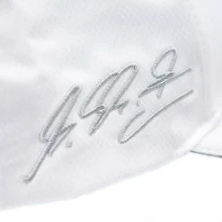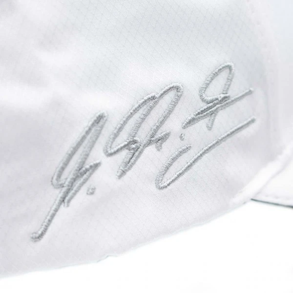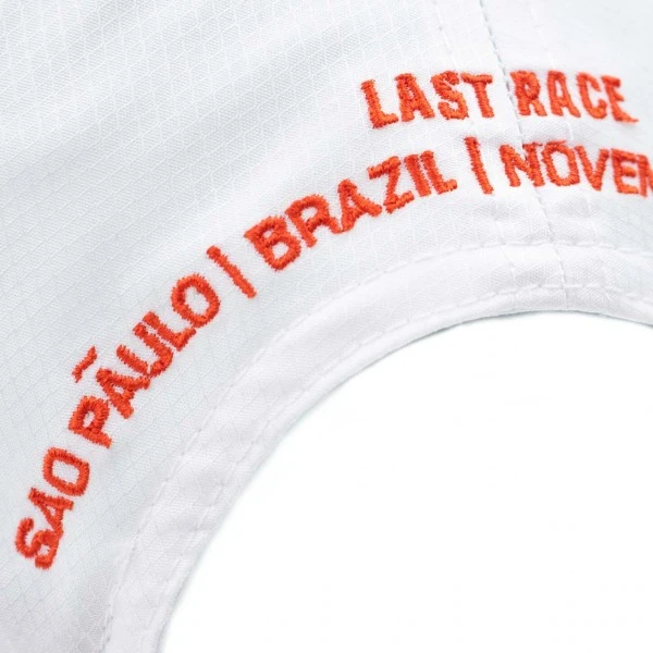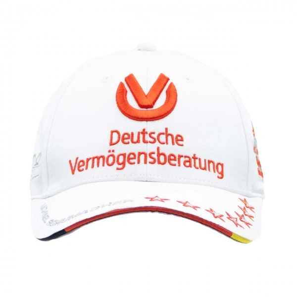 The cap in white is embroidered on the front with the distinctive logo of Deutsche Vermögensberatung, Schumacher’s main sponsor for many years. The underside of the visor is grey. On the sides are the aforementioned “THANK YOU” logo and his signature. On the back of the cap is a clip fastener for individual size adjustment.