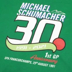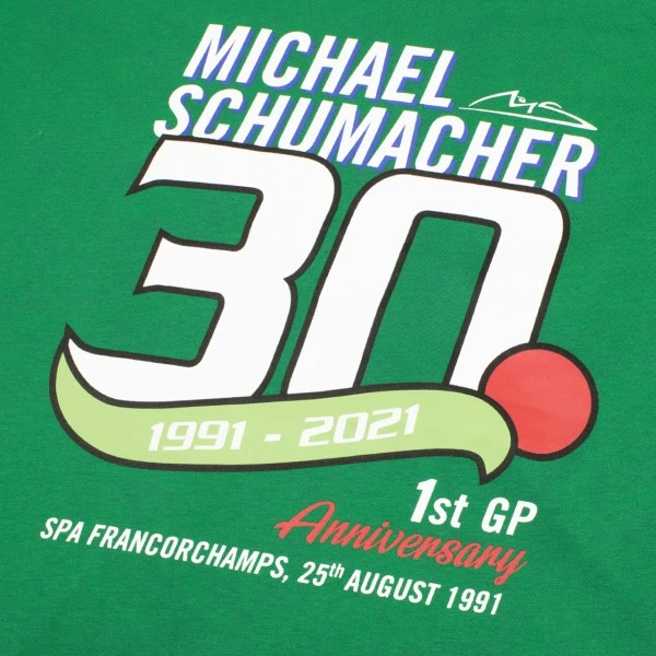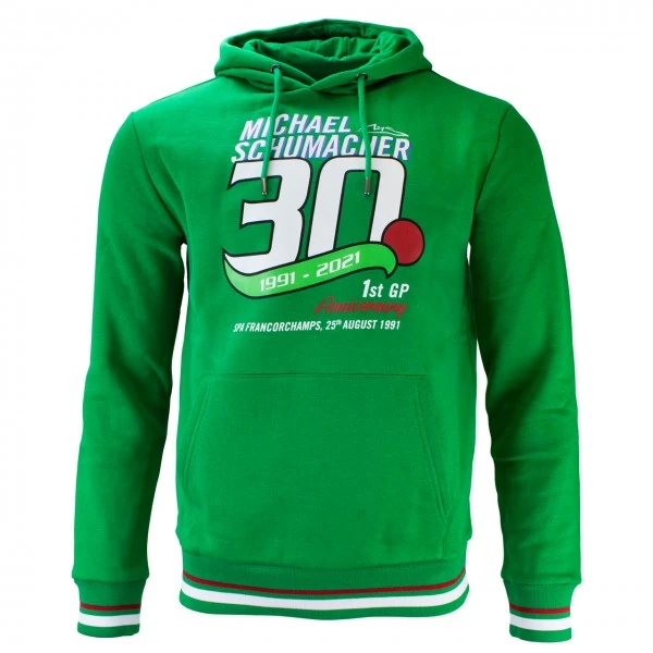 Schumacher’s name and his official logo are printed on the front of the green hoodie. It also features the anniversary number 30 with the distinctive 7UP logo and the race dates of the Spa Grand Prix. With the incorporated hood and kangaroo pocket, the jumper is the perfect companion for the cold days.