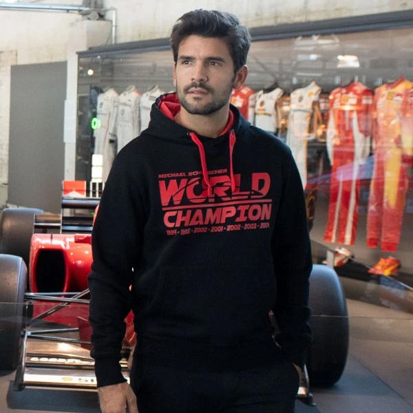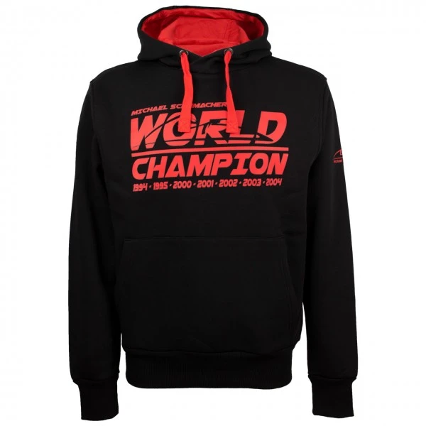 Black Michael Schumacher Hoodie from the 2018 fan collection. The sweater shows the World Champion logo with the years of his World Champion title on the chest and the signature of Michael Schumacher on the shoulder. On the sleeve is the MS logo.