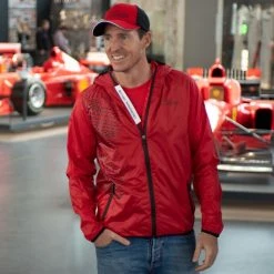 Michael Schumacher windcheater from the 2018 Speedline collection. Ultralight and thin jacket. Ideal for the racing season. With practical small bag to stow away the jacket. Optical highlights are the numerous Speedline design elements as well as the Michael Schumacher reflector on the zipper. Taped zippers, elastic sleeve cuffs and a double hood with Michael Schumacher’s world champion years complete the functional design. On the chest there is the Michael Schumacher logo, on the left sleeve the World Champion patch and on the back the Michael Schumacher signature in the shoulder area.