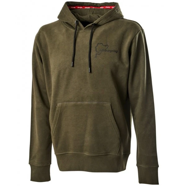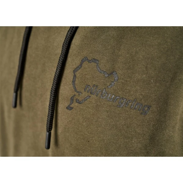 The “Community” hoodie in olive-green from the Nürburgring fan collection features the Nürburgring logo on the front. On the back, the logo is printed without lettering in a large version. Further details of the hoodie made of high-quality cotton with polyester additive are the sewn-on kangaroo pocket and the close-fitting cuffs and waistband, which ensure a comfortable fit.