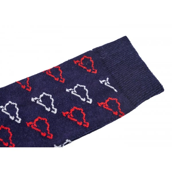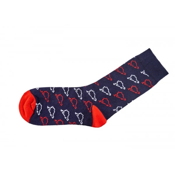 This double pack of socks in blue and grey from the Nürburgring fan collection shows the Nürburgring silhouette of the track as an all-over print. Another detail of the socks made of a cotton/polyamide/elastane blend are the red applications at the front and back.