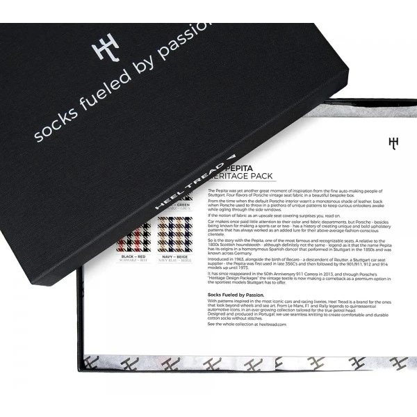 Stylish socks inspired by the legendary Pepita pattern in a variety of colours. The Pepita was another great moment of inspiration from the fine Stuttgart car makers. Four flavours of Porsche vintage seating fabric in a beautiful bespoke box.