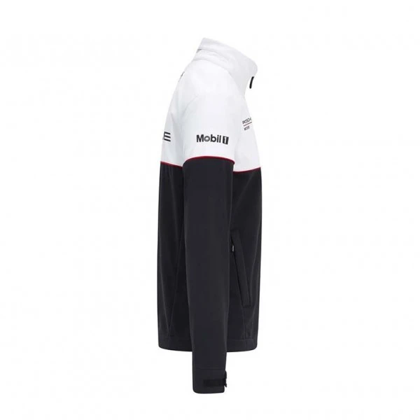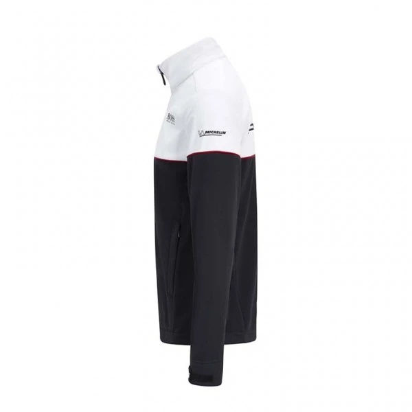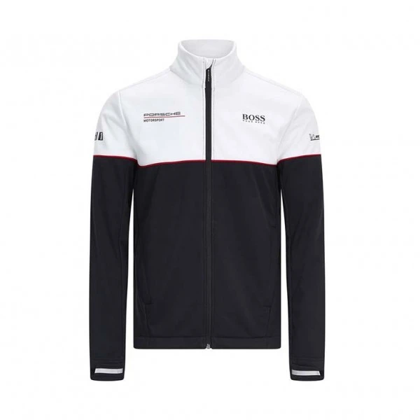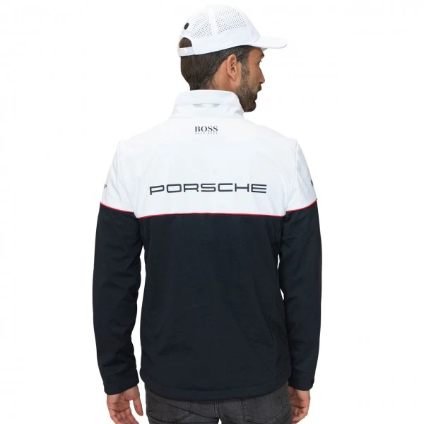 The Porsche Motorsport softshell jacket is made of easy-care polyester and has the Porsche Motorsport logo embroidered on the front. The Hugo Boss emblem is also on the front and back. A large Porsche emblem is on the back, further sponsor logos on the sleeves and complete the look of the jacket.