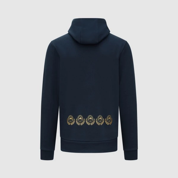 The Champions Hoodie in navy blue is part of the official Red Bull Racing team collection, which includes jumpers as well as other products such as T-shirts, jackets, accessories and more with the respective team and driver branding.
