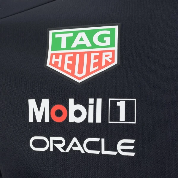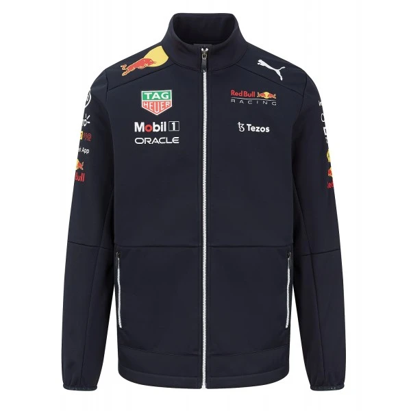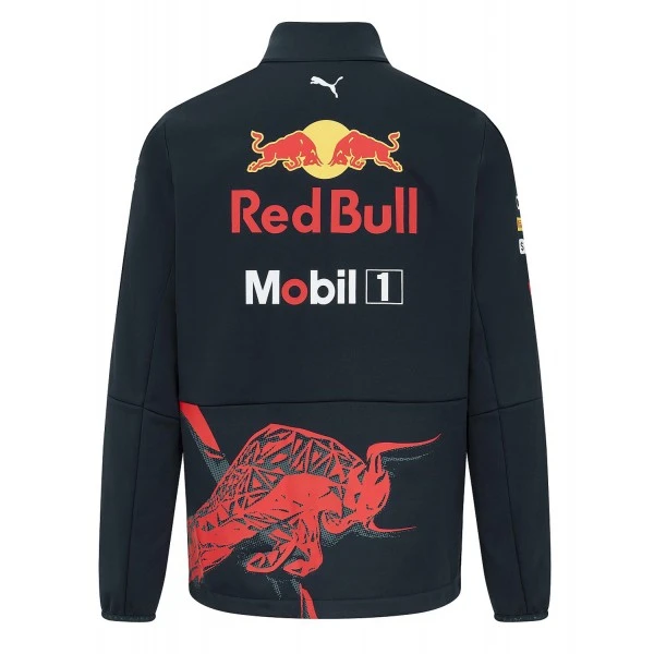 The softshell jacket in navy blue is part of the official Red Bull Racing team collection, which includes jackets as well as other products such as T-shirts, sweatshirts, accessories and more with the respective team and driver branding.