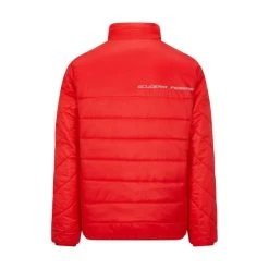 This red quilted jacket is ideal for colder days. It features a front zip with rubber puller and button placket on the collar, as well as two side pockets.