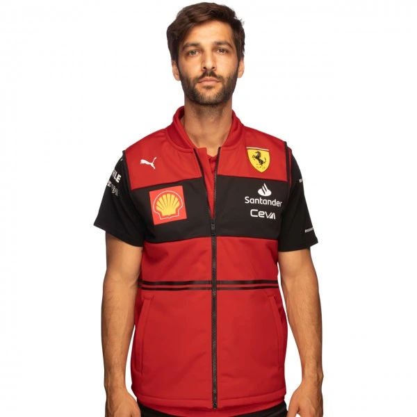 The team waistcoat in red is part of the official Scuderia Ferrari team collection, which includes waistcoats as well as other products such as caps, T-shirts and polo shirts.
