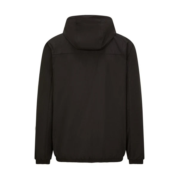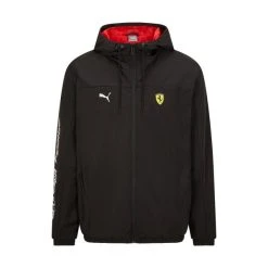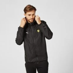 The black windbreaker jacket for men is part of the official Scuderia Ferrari collection, which includes jackets as well as other products such as T-shirts, sweatshirts, accessories and more with the Ferrari branding.