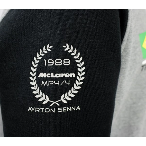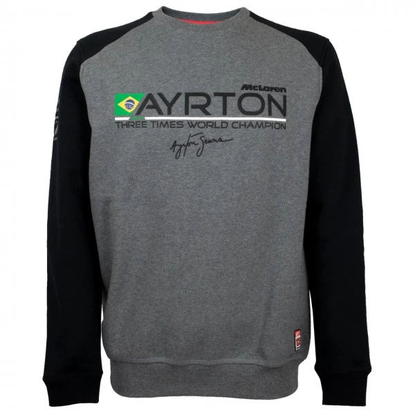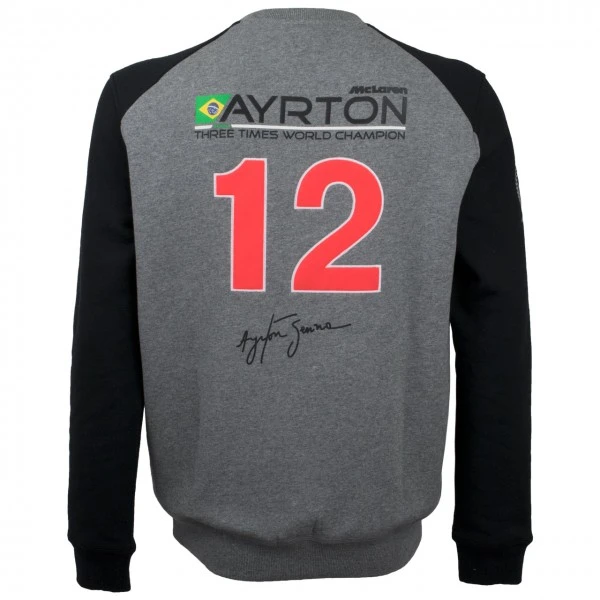 The Ayrton Senna pullover was created in cooperation with McLaren and thematically takes up his three world championship titles from 1988, 1990 and 1991. The black/grey sweatshirt with Senna print on the chest has Ayrton Senna’s starting number 12 on the back. The sweatshirt has numerous small design elements such as the McLaren logo, Ayrton Senna’s signature and his starting number 12.